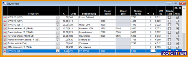 Analog zum Steuercode für 10% ist der Steuercode für 5% einzurichten. Die Zuordnung zum neuen Steuerformular ist derzeit noch nicht definiert. Ebenso ist für die Vorsteuer ein neuer Code einzurichten.*