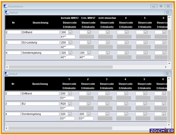 Beispiel „Sonderregelung“ – diese Bezeichnung kann frei gewählt werden: Die Einstellung für die Konten ist der alten Einstellung für Inlandskunden anzupassen. Für EU-Geschäfte ist eine zusätzliche Klasse mit zusätzlichen Steuercodes erforderlich.