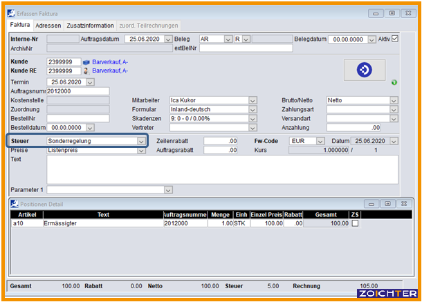 Der Vorschlag der Steuerklasse ist während der Gültigkeit dieser Regelung manuell auf „Sonderregelung“ zu ändern – wann immer ermäßigte Artikel fakturiert werden sollen. Eine Kombination von 20%igen Artikeln und 5%igen Artikeln ist ebenso möglich.