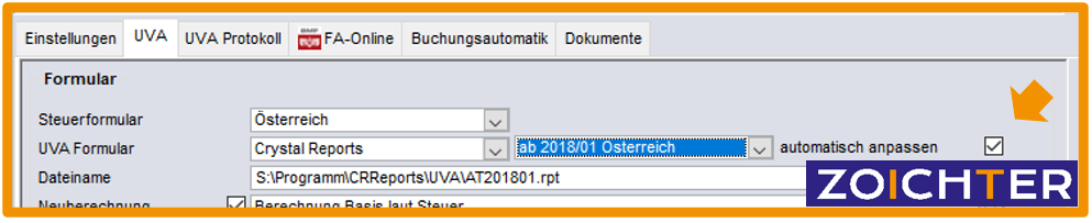 EuroFib bietet die Möglichkeit, neue Steuerformulare automatisch anzupassen. Dadurch brauchen Sie zukünftig neue Steuerformulare nicht mehr manuell einzutragen. Aktivieren Sie dazu einfach die Checkbox „automatisch anpassen“ im Menüpunkt Finanzamt => UVA.